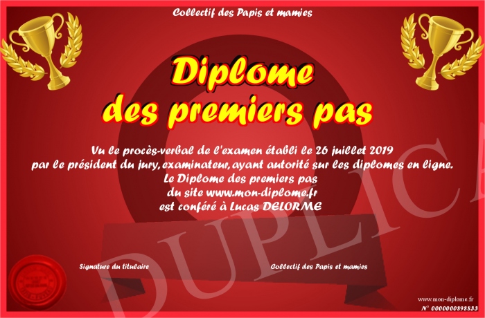 Envoyez par email votre Diplôme des premiers pas personalisé