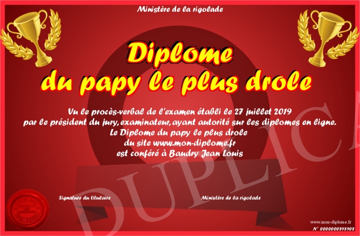 Envoyez par email votre Diplôme du papy le plus drôle personalisé