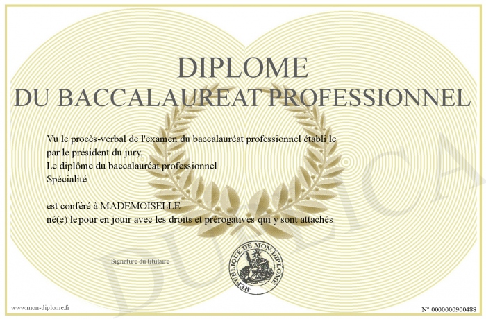 Envoyez par email votre DIPLOME DU BACCALAUREAT PROFESSIONNEL personalisé