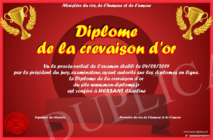 Envoyez par email votre Diplome de la crevaison d'or personalisé