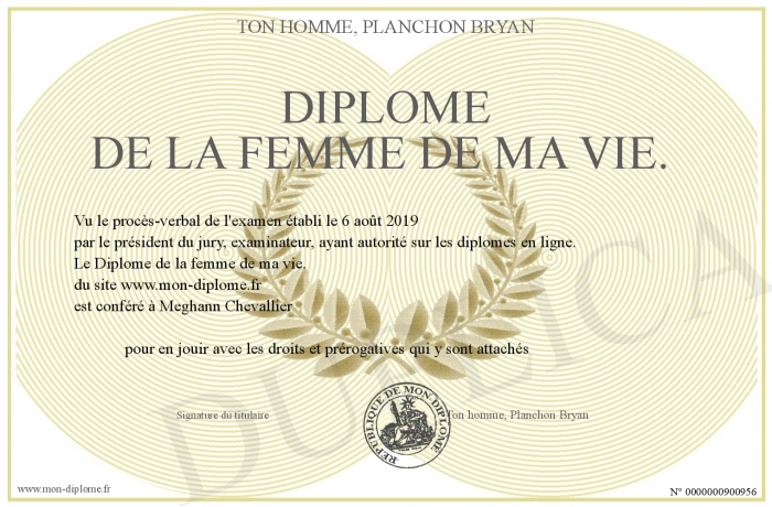 Envoyez par email votre Diplôme de la femme de ma vie. personalisé
