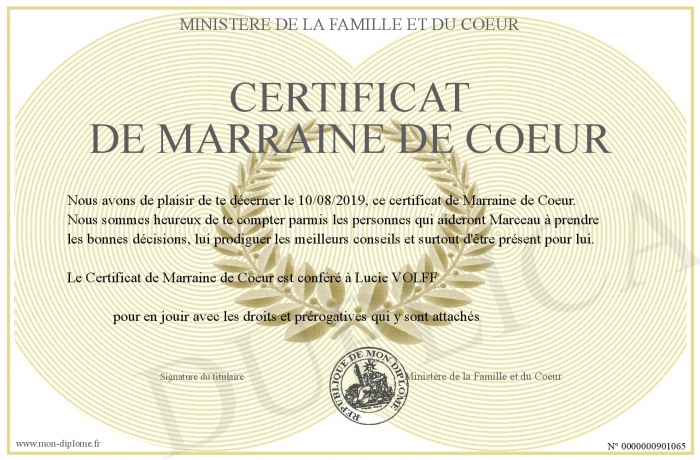 Envoyez par email votre Certificat de Marraine de Coeur personalisé