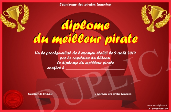 Envoyez par email votre diplome du meilleur pirate personalisé