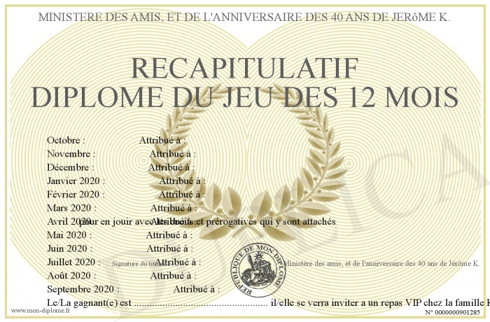 Envoyez par email votre RECAPITULATIF DIPLOME du JEU DES 12 mois personalisé