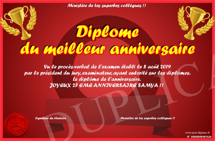 Envoyez par email votre Diplôme du meilleur anniversaire personalisé