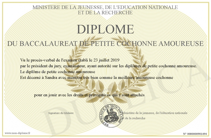 Envoyez par email votre Diplôme du baccalaureat de petite cochonne amoureuse personalisé