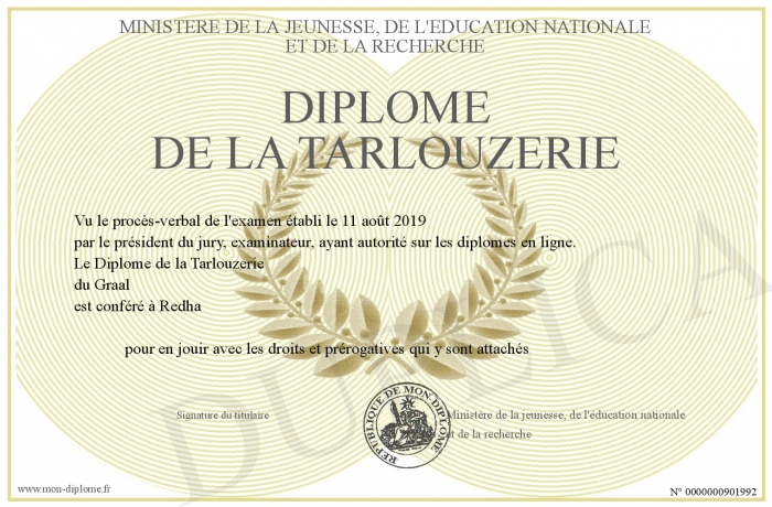 Envoyez par email votre Diplôme de la Tarlouzerie personalisé