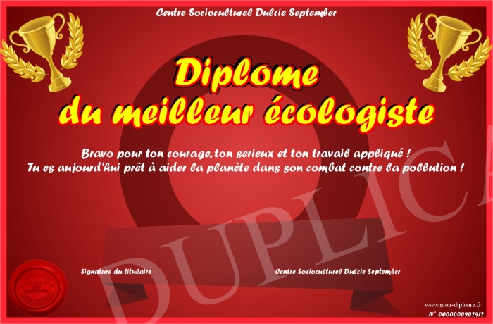 Envoyez par email votre Diplôme du meilleur écologiste personalisé