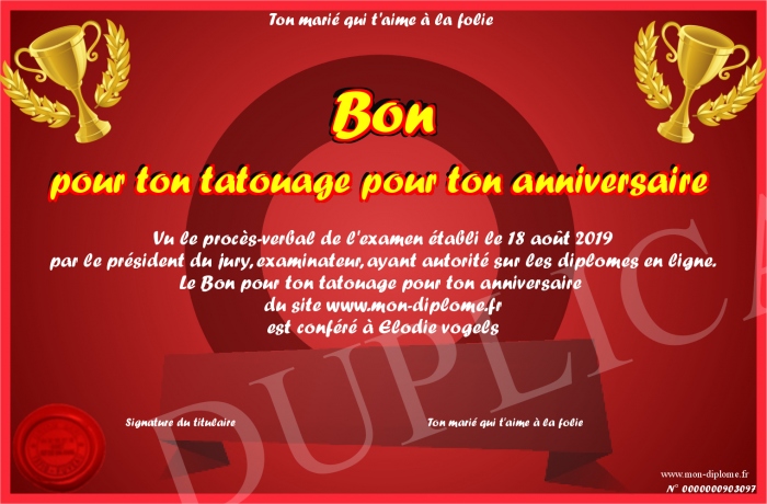 Envoyez par email votre Bon pour ton tatouage pour ton anniversaire personalisé