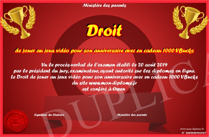 Envoyez par email votre Droit de jouer au jeux vidéo pour son anniversaire avec en cadeau 1000 VBucks personalisé