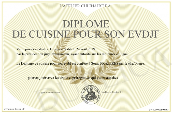 Envoyez par email votre Diplôme de cuisine pour son evdjf personalisé