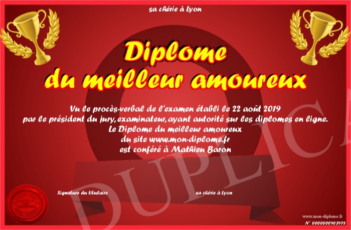 Envoyez par email votre Diplôme du meilleur amoureux personalisé
