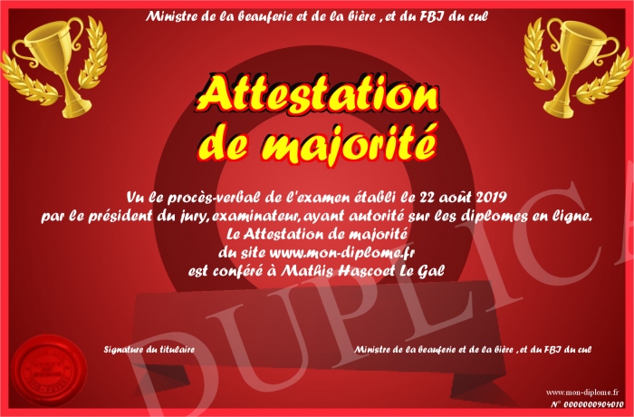 Envoyez par email votre Attestation de majorité personalisé
