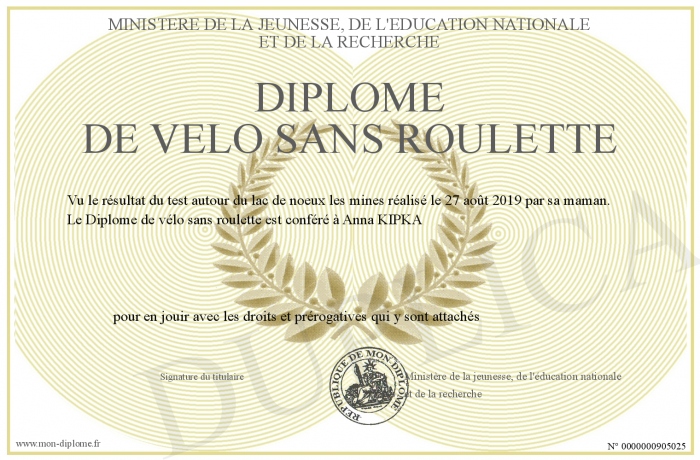 Envoyez par email votre Diplôme de vélo sans roulette personalisé