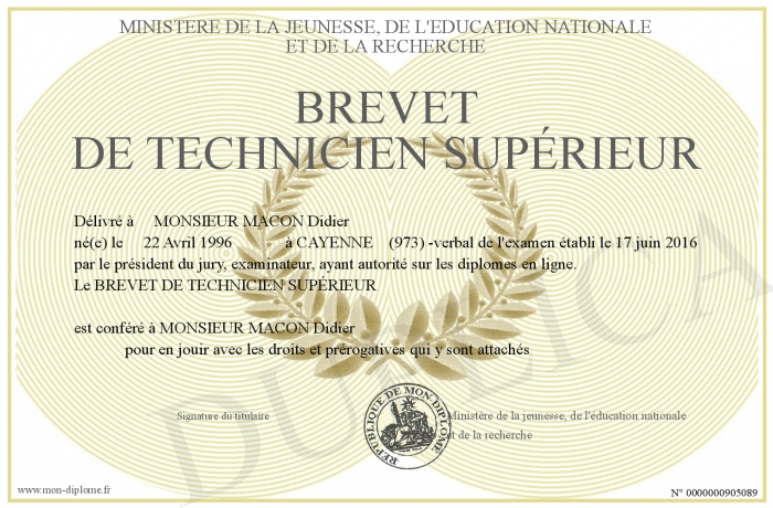 Envoyez par email votre BREVET DE TECHNICIEN SUPÉRIEUR personalisé