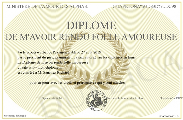 Envoyez par email votre Diplôme de m'avoir rendu folle amoureuse personalisé
