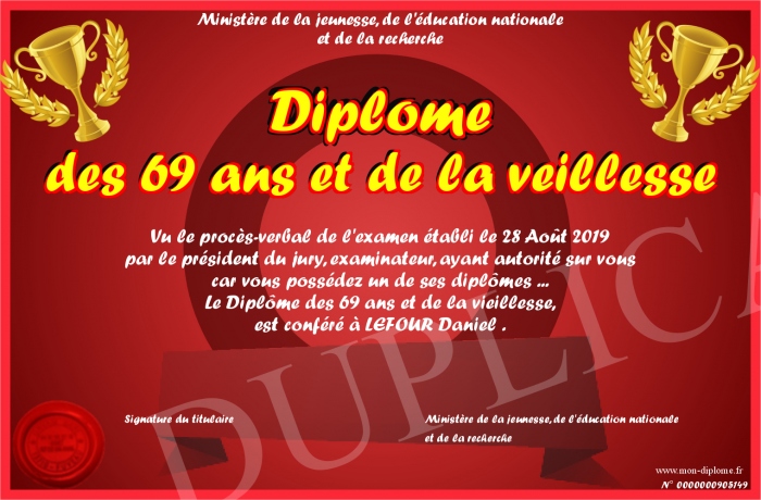 Envoyez par email votre Diplôme des 69 ans et de la veillesse personalisé