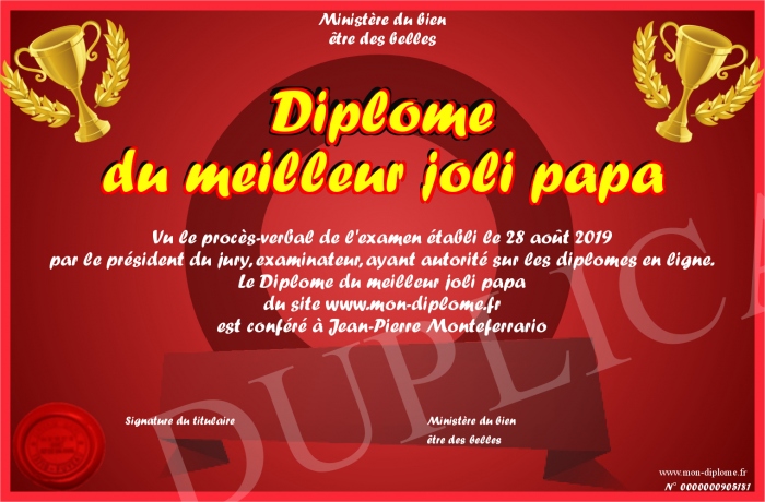 Envoyez par email votre Diplôme du meilleur joli papa personalisé
