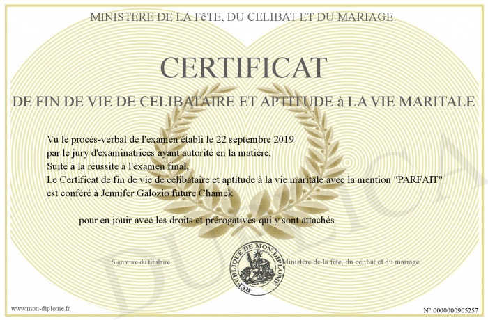 Envoyez par email votre Certificat de fin de vie de célibataire et aptitude à la vie maritale personalisé