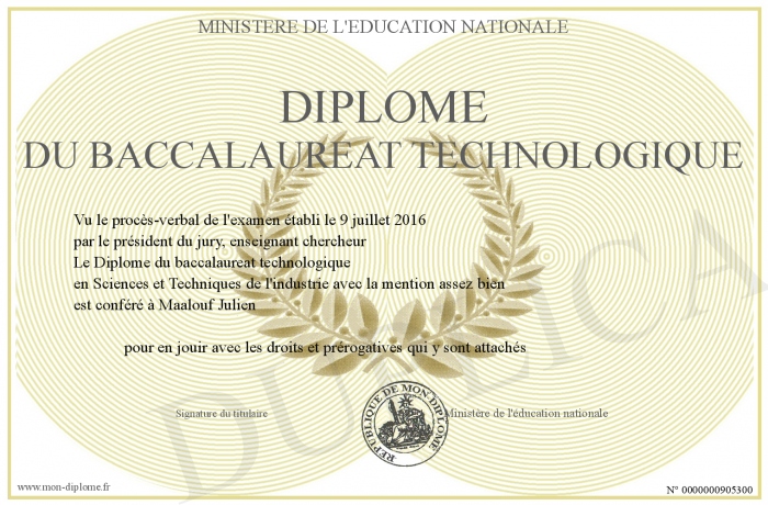 Envoyez par email votre Diplôme du baccalaureat technologique personalisé