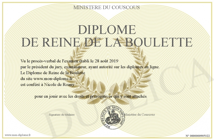 Envoyez par email votre Diplôme de Reine de la Boulette personalisé