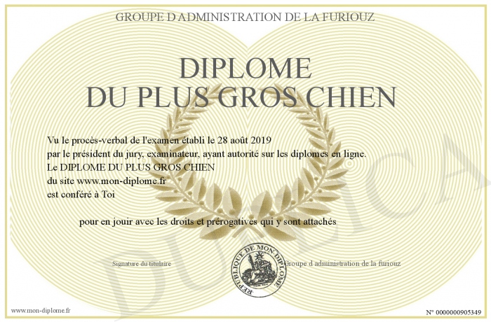 Envoyez par email votre DIPLOME DU PLUS GROS CHIEN personalisé