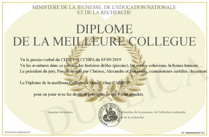 Envoyez par email votre Diplôme de la meilleure Collègue personalisé