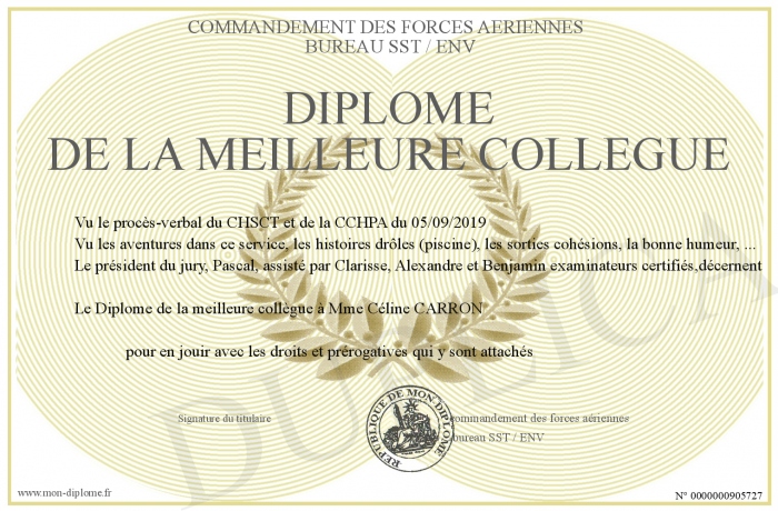 Envoyez par email votre Diplôme de la meilleure collègue personalisé