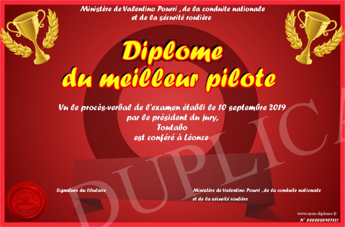 Envoyez par email votre Diplôme du meilleur pilote personalisé