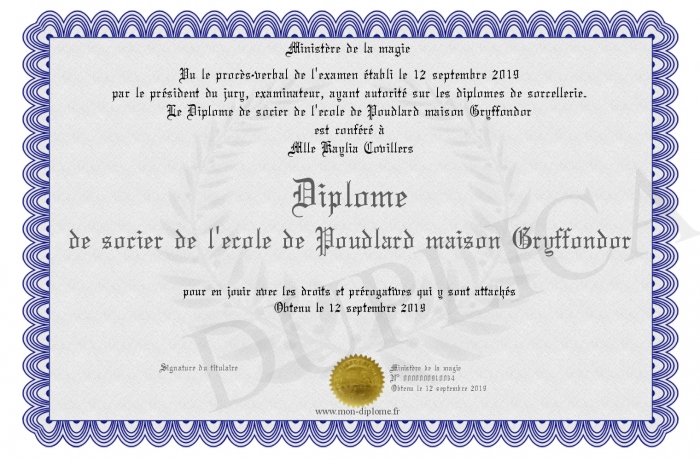 Envoyez par email votre Diplome de socier de l'ecole de Poudlard maison Gryffondor personalisé