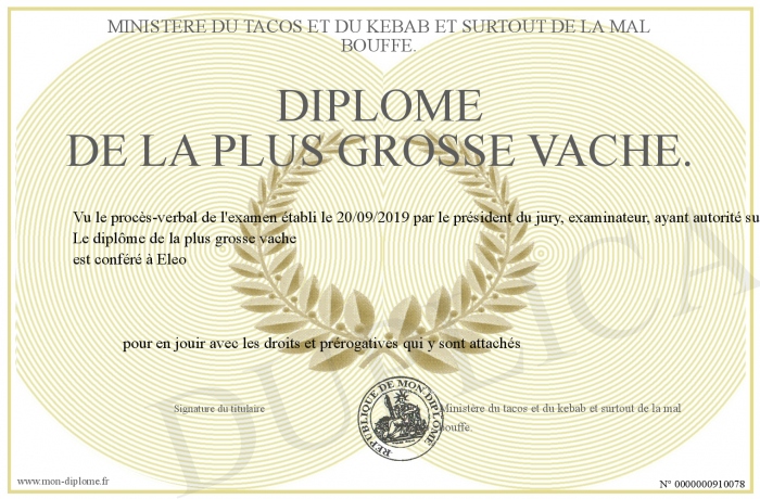 Envoyez par email votre Diplôme de la plus grosse vache. personalisé