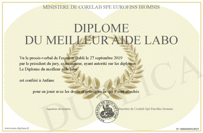 Envoyez par email votre Diplôme du meilleur aide labo personalisé