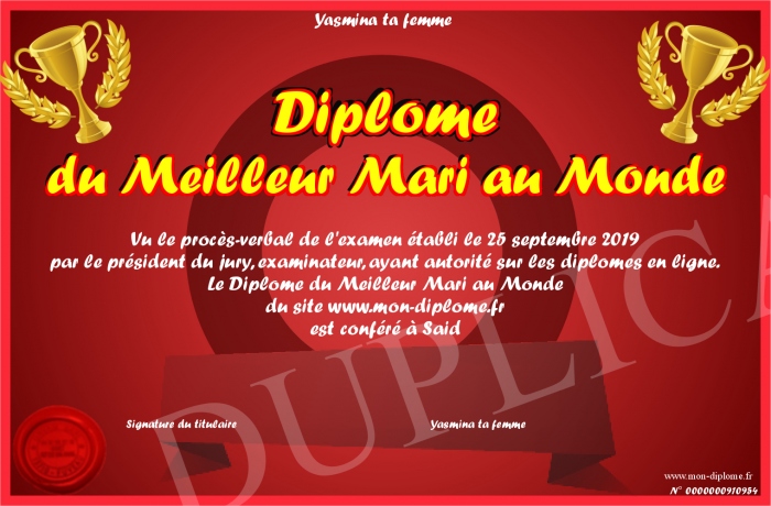 Envoyez par email votre Diplôme du Meilleur Mari au Monde personalisé