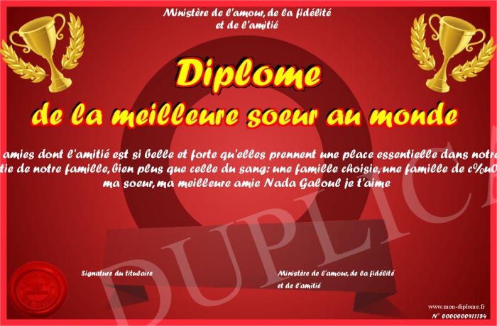 Envoyez par email votre Diplôme de la meilleure soeur au monde personalisé