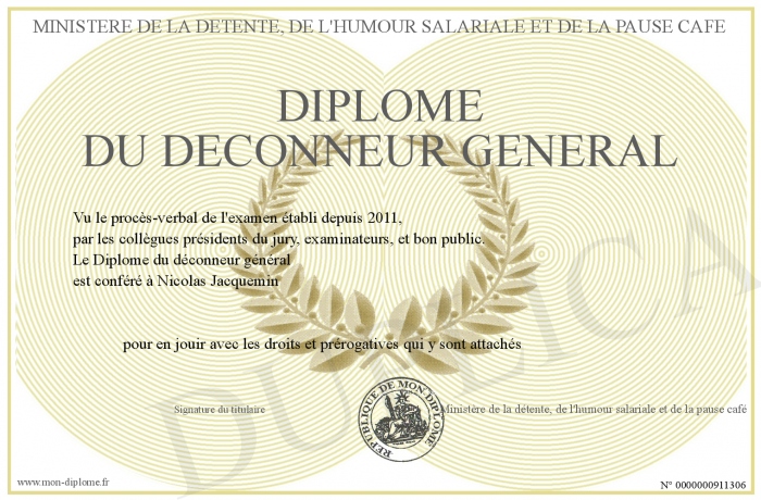 Envoyez par email votre Diplôme du déconneur général personalisé