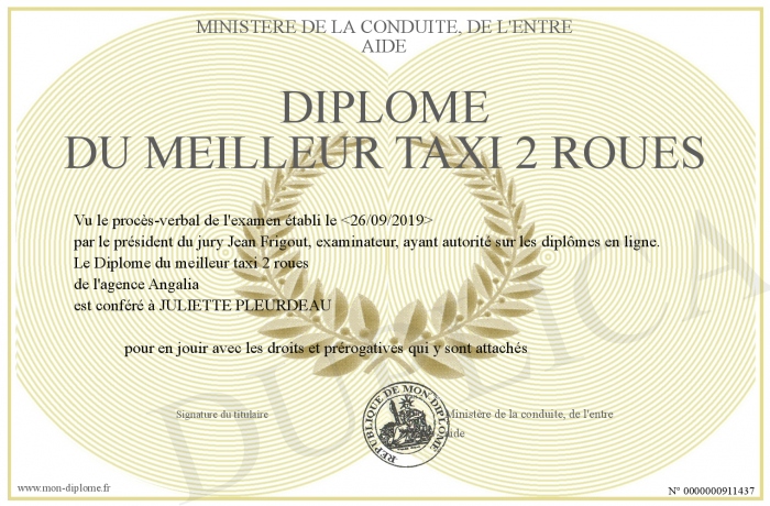 Envoyez par email votre Diplôme du meilleur taxi 2 roues personalisé