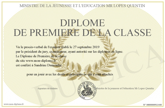 Envoyez par email votre Diplôme de Première de la classe personalisé