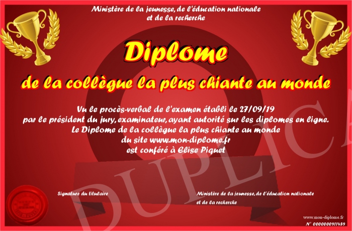 Envoyez par email votre Diplôme de la collègue la plus chiante au monde personalisé