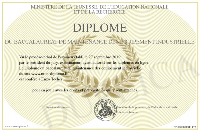 Envoyez par email votre Diplôme du baccalaureat de maintenance des equipement industrielle personalisé