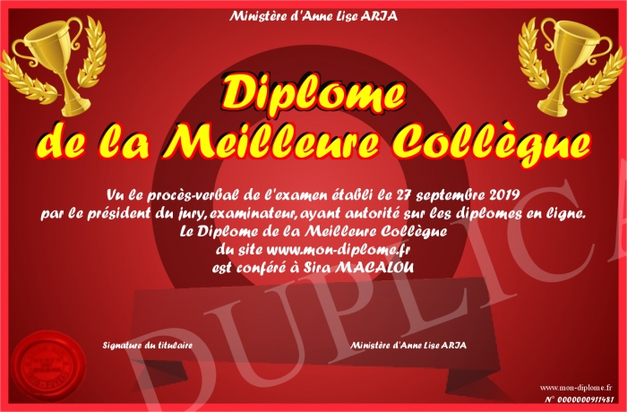 Envoyez par email votre Diplôme de la Meilleure Collègue personalisé