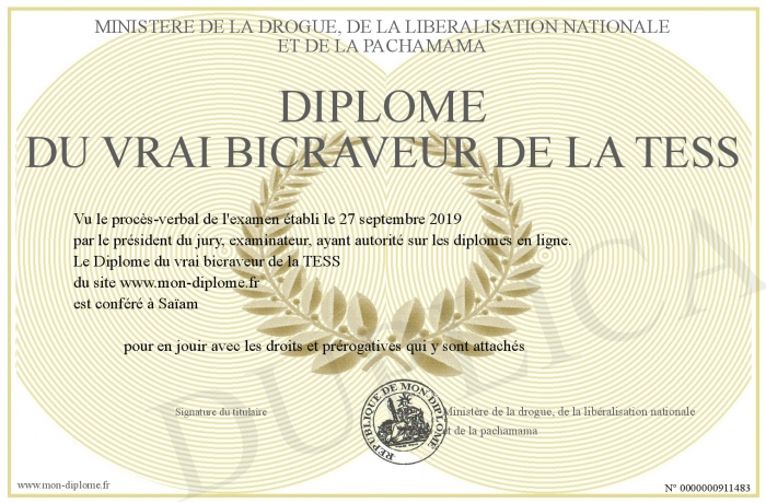Envoyez par email votre Diplôme du vrai bicraveur de la TESS personalisé