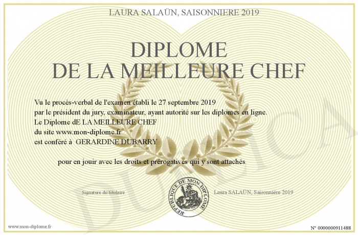 Envoyez par email votre Diplôme dE LA MEILLEURE CHEF personalisé