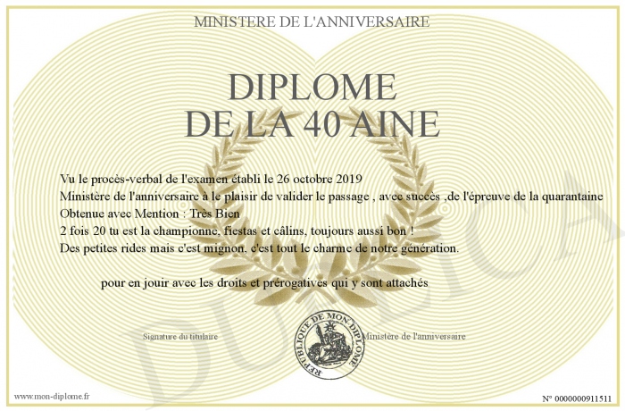 Envoyez par email votre Diplôme de la 40 Aine personalisé