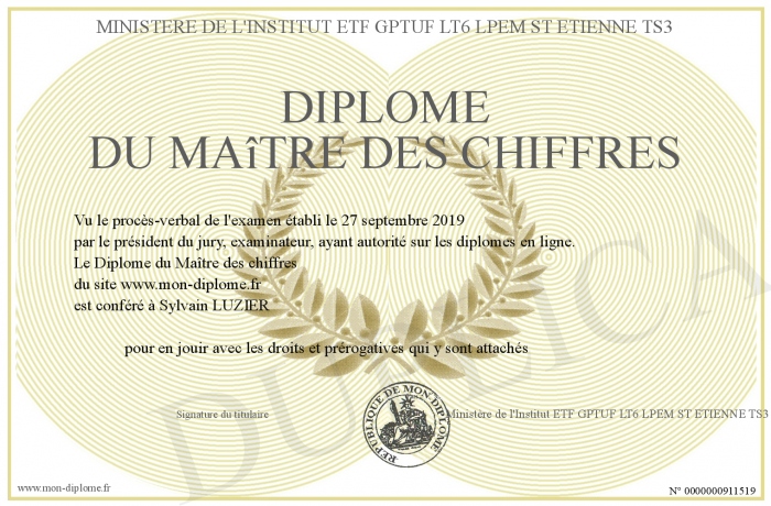 Envoyez par email votre Diplôme du Maître des chiffres personalisé
