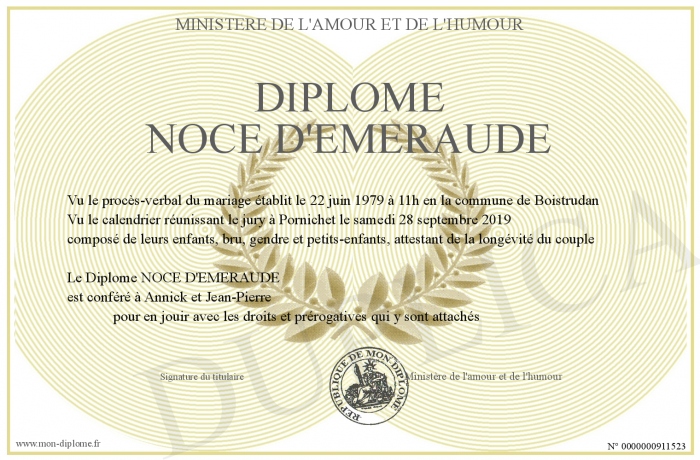 Envoyez par email votre Diplôme NOCE D'EMERAUDE personalisé