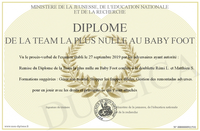 Envoyez par email votre Diplôme de la Team la plus nulle au Baby Foot personalisé