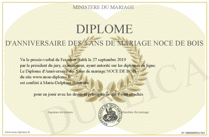 Envoyez par email votre Diplôme d'Anniversaire des 5 ans de mariage NOCE DE BOIS personalisé