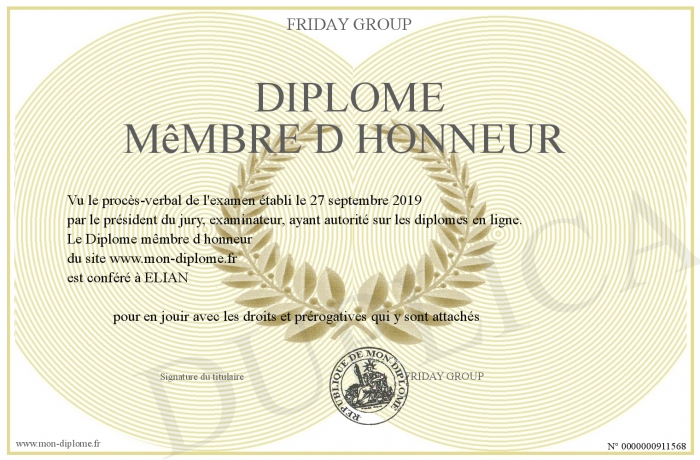 Envoyez par email votre Diplôme mêmbre d honneur personalisé