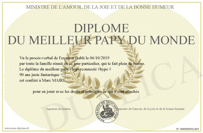 Envoyez par email votre Diplôme du meilleur papy du monde personalisé