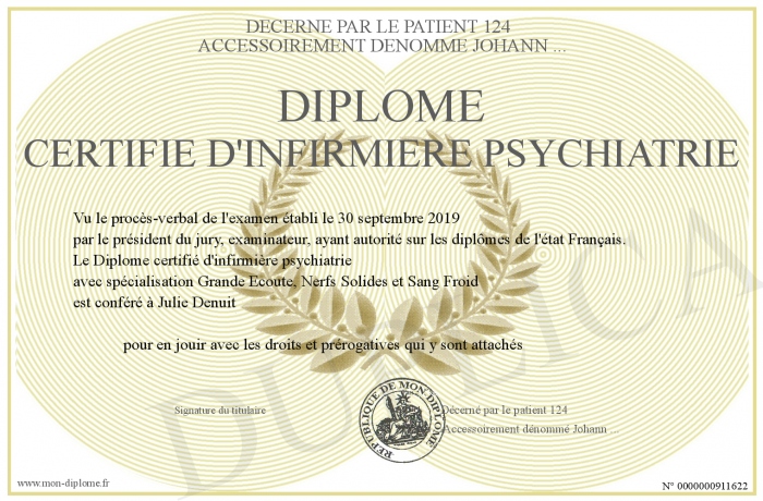 Envoyez par email votre Diplôme certifié d'infirmière psychiatrie personalisé